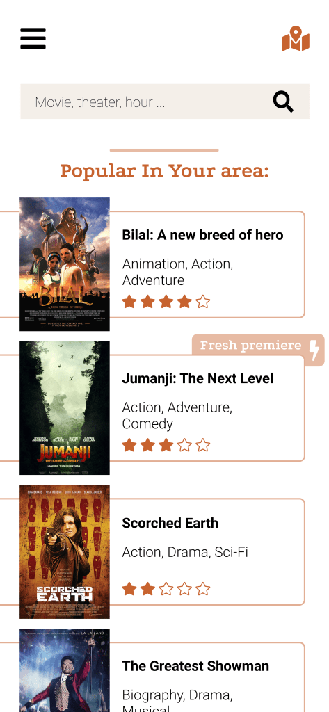 - Additional features: Map of all local cinemas, ability to search by hour, fresh premieres clearly marked.