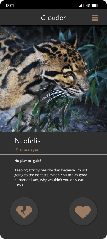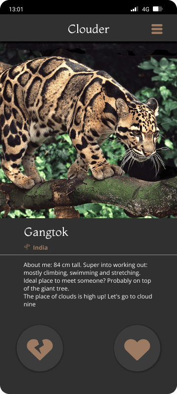 I decided to go with the idea to create a dating app for Leopards. Hear me out! It is obviously not very likely that a clouded leopard would use a dating app. But it gives opportunity to seek in a good deal of information, and let users know much more about those amazing creatures in a style many can be already used to consuming information.